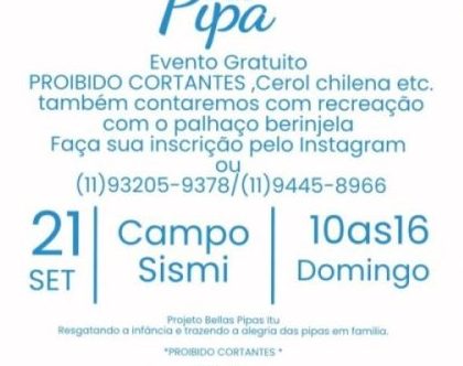 No dia 21 de setembro de 2025, a Ong Bellas Pipas de Itu, realizará nas dependências da Sede Social do SISMI o evento OFICINA DE PIPA, voltado a conscientizar crianças e adultos dos riscos de acidentes com a prática de soltar pipas, bem como, resgatar a infância, o lazer e a cultura, integrando crianças, adultos …