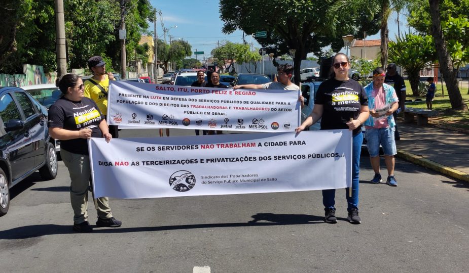 Contando com a presença dos vereadores Saltenses Chell/PT e Graziella/PSB, servidores municipais saltenses, dirigentes de entidades sindicais da região e população, a caminhada que partiu da Praça da Saudade e terminou em frente a Câmara Municipal, demonstrou à população e comerciantes da região central da cidade, o que realmente representa a PEC 38 – Reforma Administrativa e o Projeto de Lei que propõe a terceirização de serviços públicos do município.