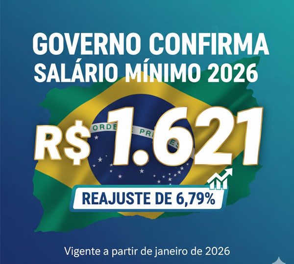 A partir do dia 1 de janeiro de 2026, o valor do salário mínimo passa a ser de R$ 1.621,00, o que representa um reajuste de 6.78%.